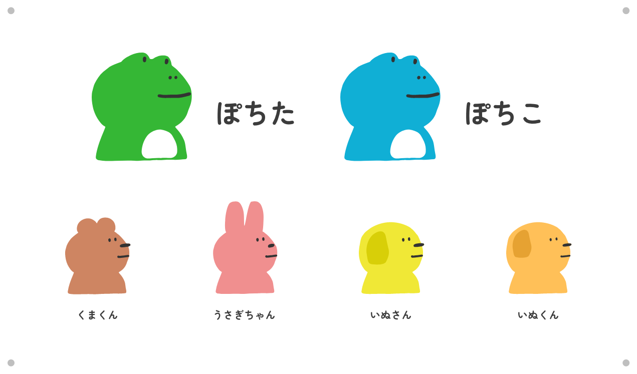 • マスコットキャラクター「ぽちた」:緑色の生き物の象徴として、カエルをモチーフに。あえて手書き風のタッチで、親しみやすさを演出