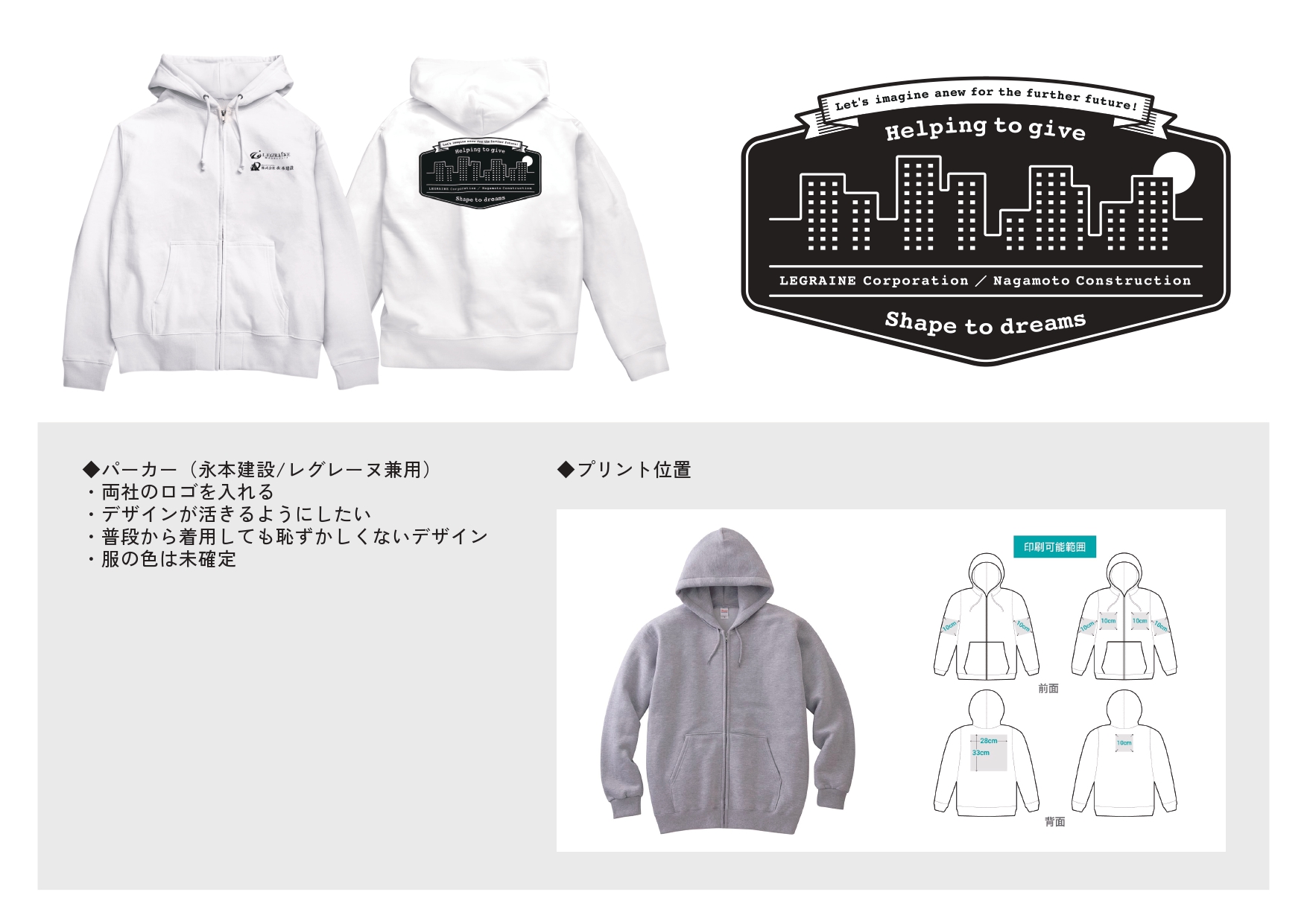 私服としても違和感のない会社用パーカー/トレーナーを制作。バックに建設会社らしい街並みの大胆なプリントを配置し、オリジナリティあふれるデザインに仕上げました。